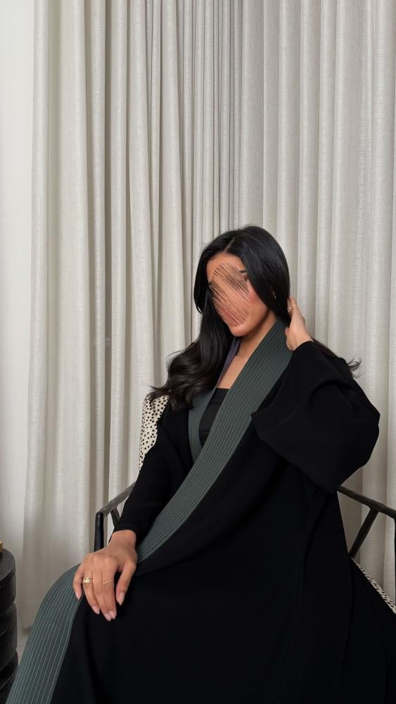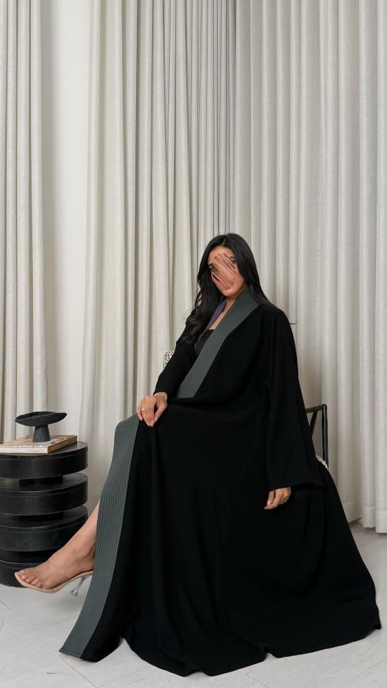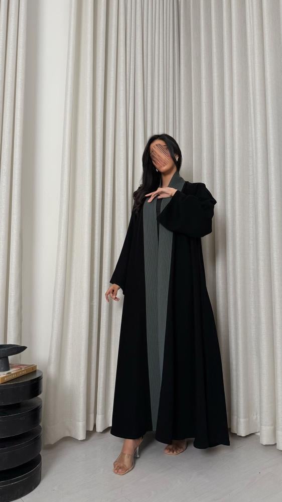 كريب اسود مع دق خيط موف و زيتي و الياقه الداخليه قماش موف وزيتي